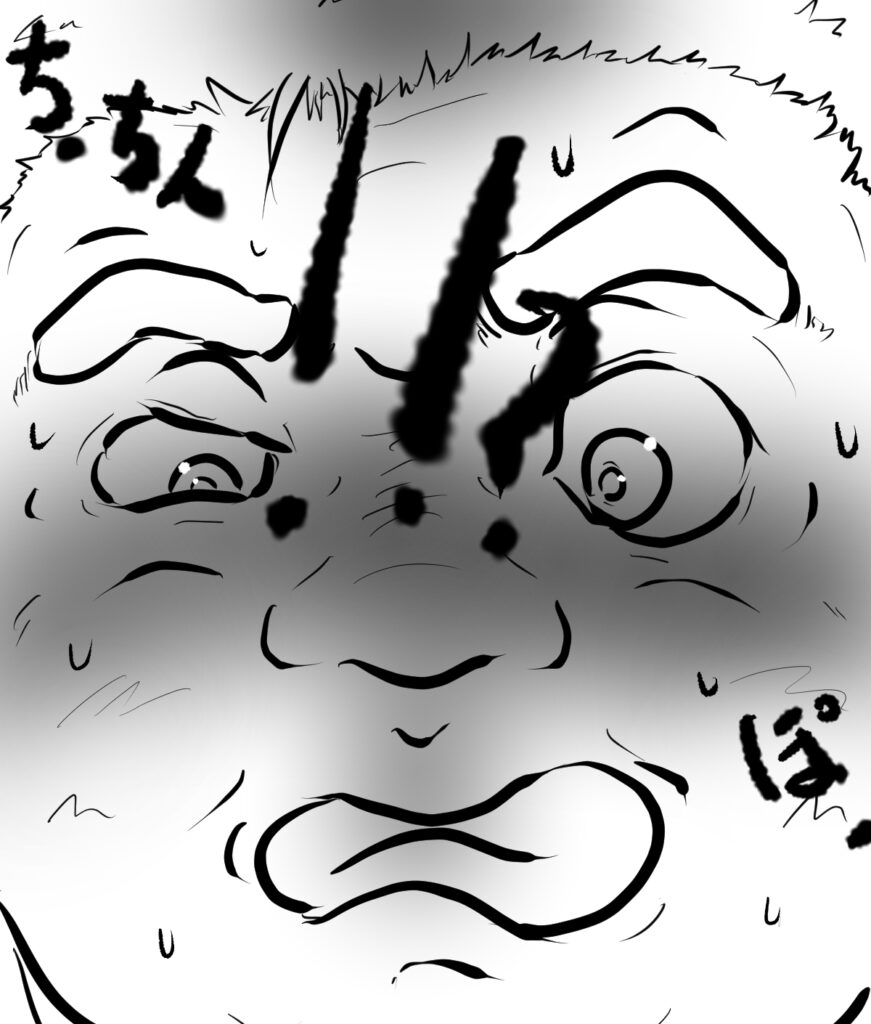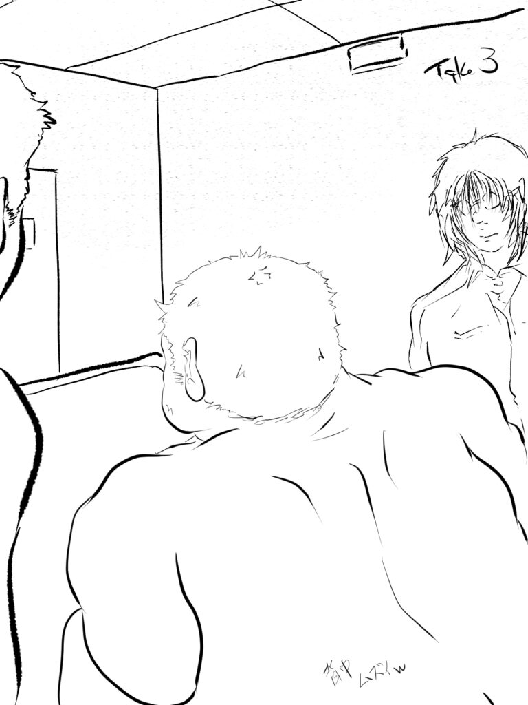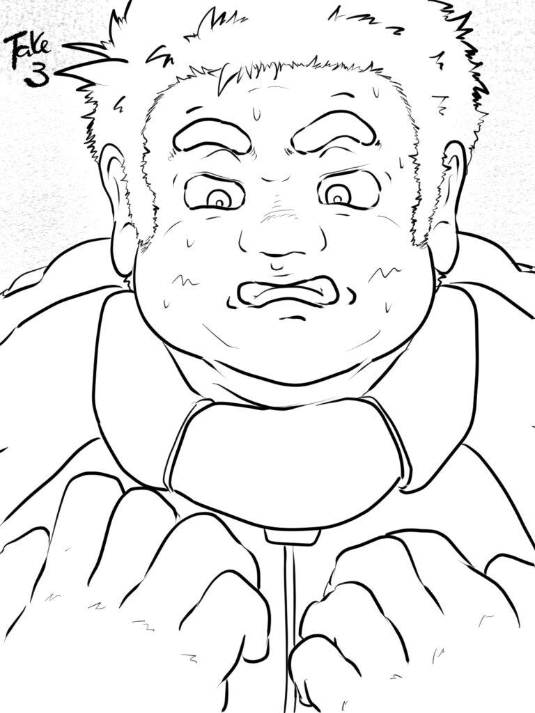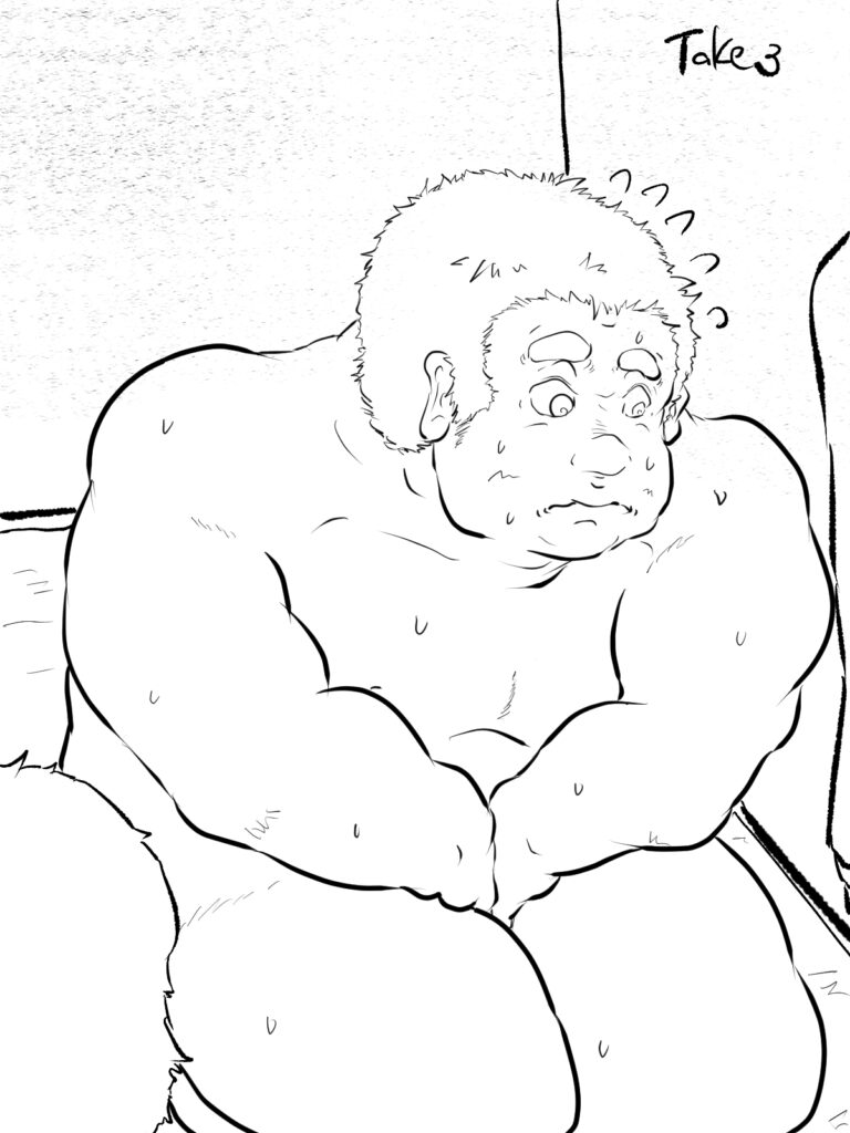 かくしてその訴えは見事に叶えられたようだが、何やら怪しい雲行きを相手の挙動から察して、顔つきに不安が広がる裸の大将、ならぬ、マッパのオタクだ。