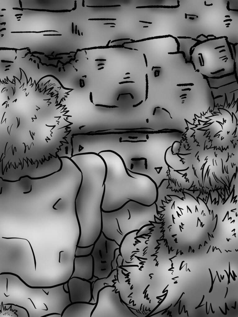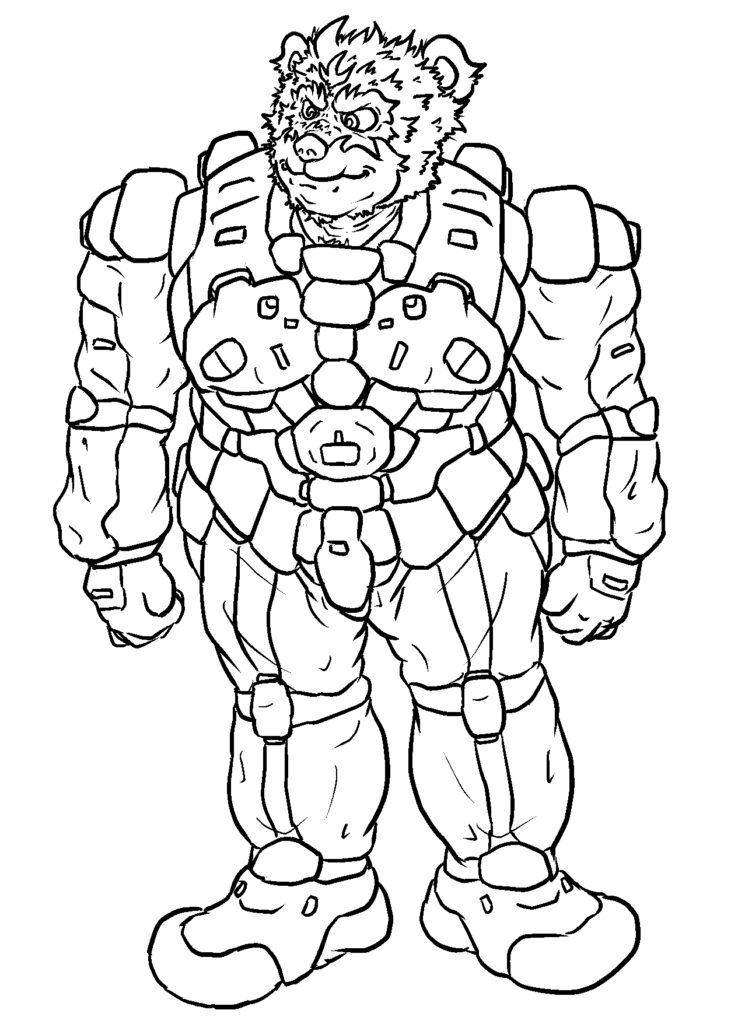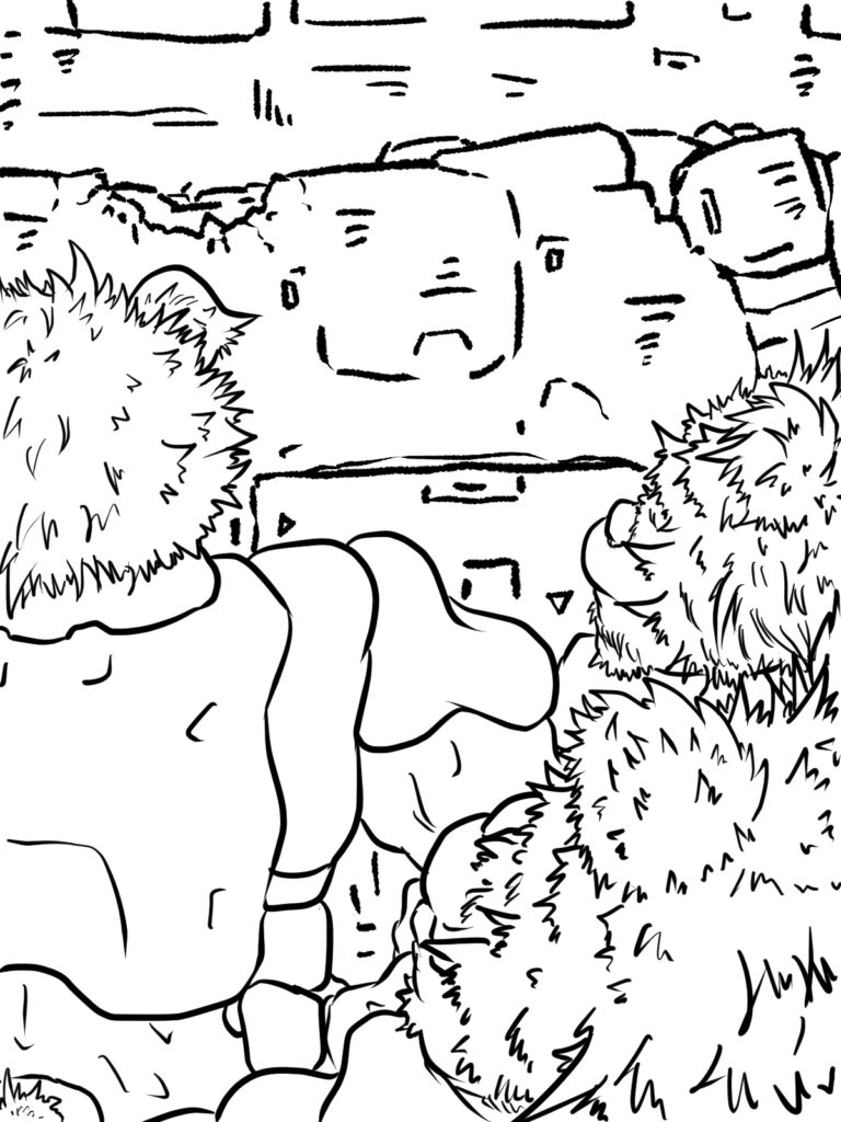 相棒の大型アーマーの格納されたハンガー・デッキに近づくと、このコクピット・ブロックに相当する、ずっと高い場所から若いクマ族の青年メカニックが手を振っているのを認める。